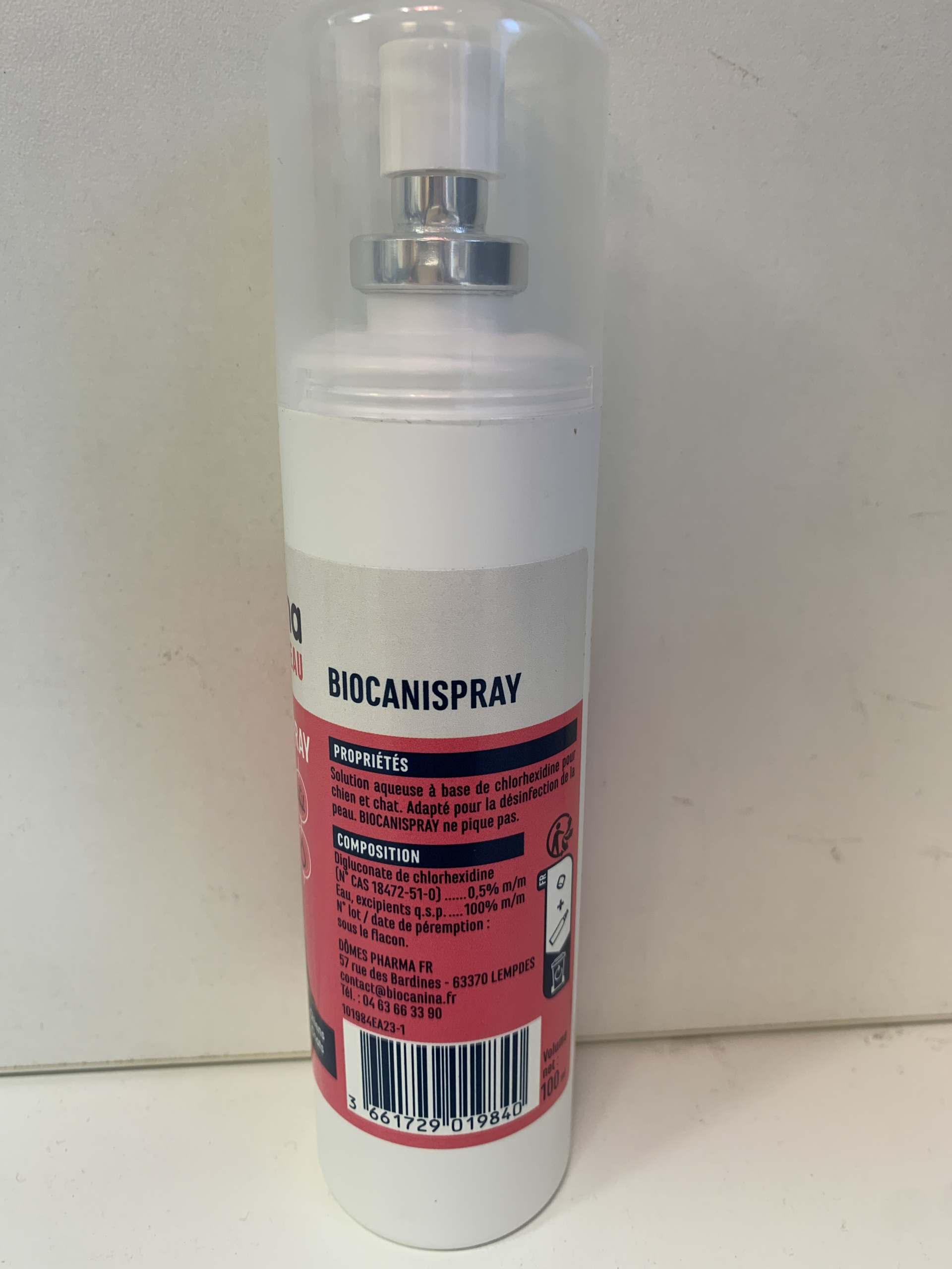 Solution aqueuse à base de Chlorhexidine pour le nettoyage et la désinfection de la peau des chiens et chats. Spray 100ml