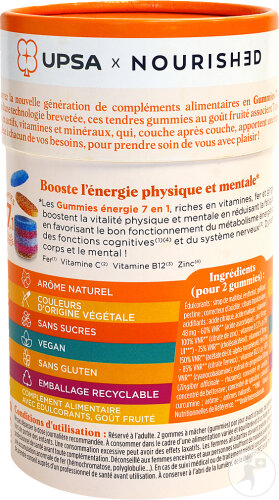 Issues du laboratoire UPSA, les gummies 7 en 1 énergie est Complément alimentaire sans sucres boostant l’énergie physique et mentale.