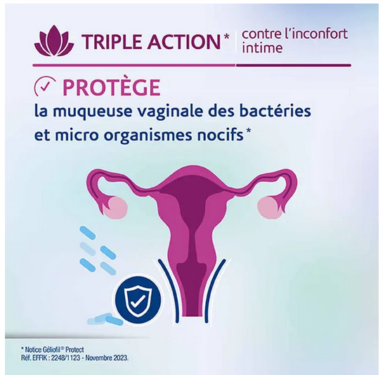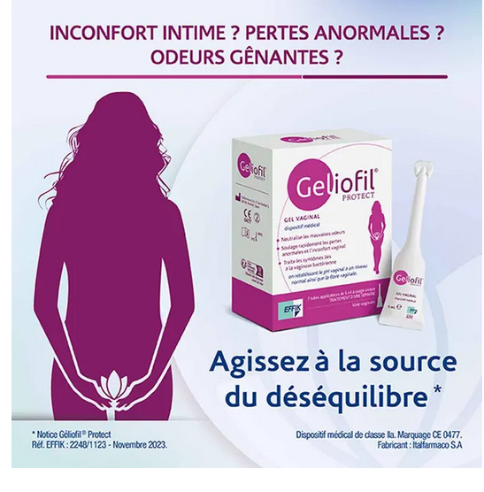 Géliofil® Protect est un gel vaginal permettant de lutter contre l’inconfort intime et la vaginose bactérienne. Géliofil® Protect est un dispositif médical de classe IIa doté d’une triple action :