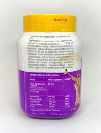 sirop de glucose, saccharose, eau, gélatine d’origine bovine, concentré de jus de raisin blanc, acide L-ascorbique, régulateur d’acidité : acide citrique ; gluconate de zinc, arôme fruit de la passion, concentré de carthame et de spiruline, concentré de jus de carotte noire, arôme fraise, arôme framboise, arôme orange, huile de coco, maltodextrine, extrait de baies d’argousier commun, phytoménadione, cholécalciférol, agent d’enrobage : cire de carnauba ; acide folique.