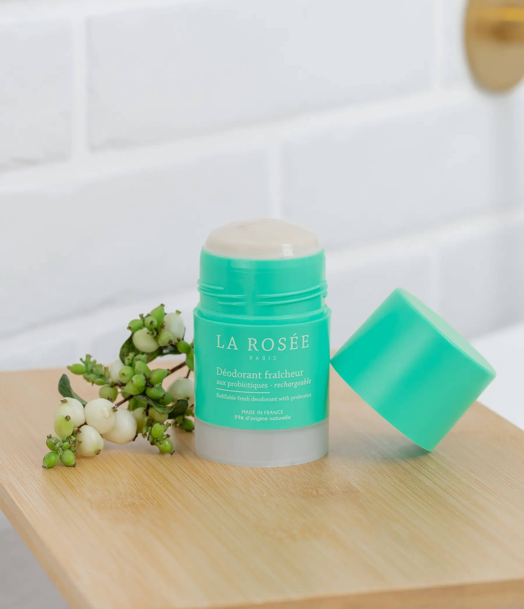 Le déodorant fraîcheur aux probiotiques rechargeable de La Rosée, régule la transpiration, absorbe l’humidité et neutralise les odeurs efficacement : sensation de fraîcheur et de confort toute la journée !