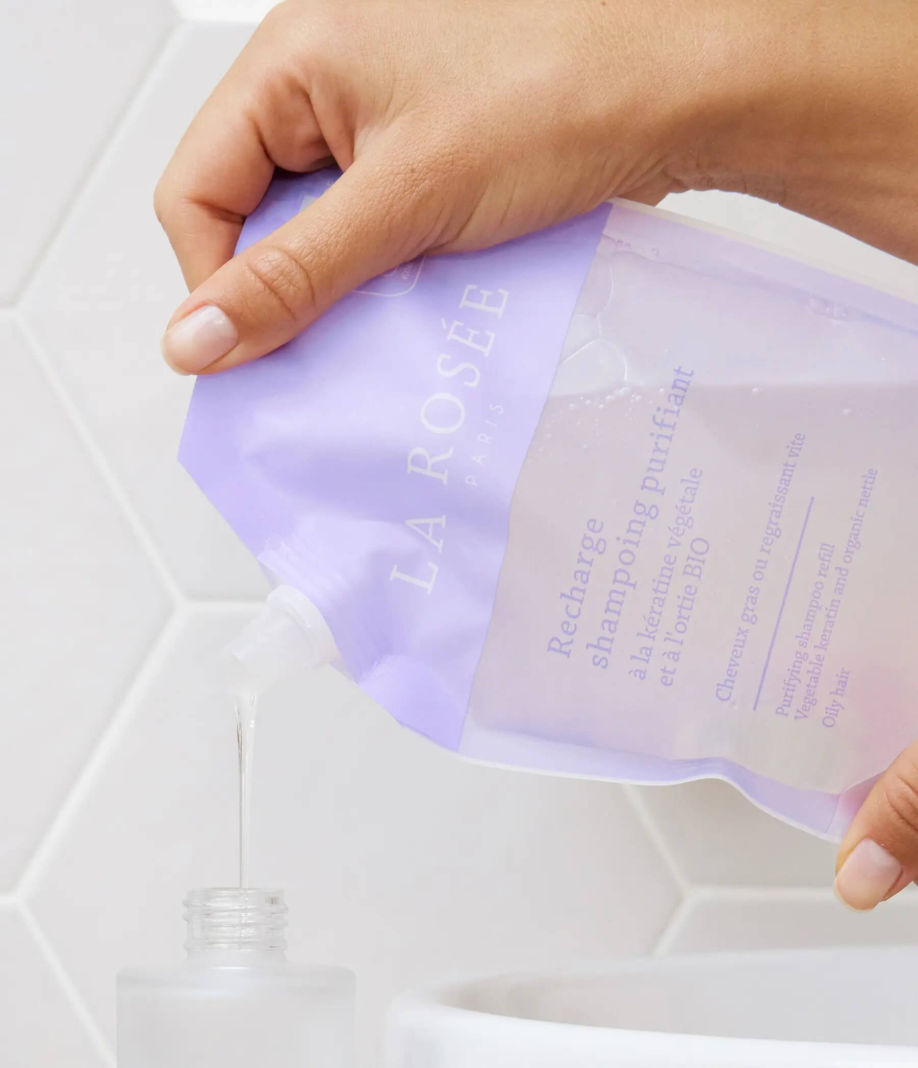 Formulé sans sulfates, ni silicones, le shampoing purifiant La Rosée nettoie efficacement les cheveux, apaise et rééquilibre le cuir chevelu pour éviter qu’il ne regraisse trop vite.