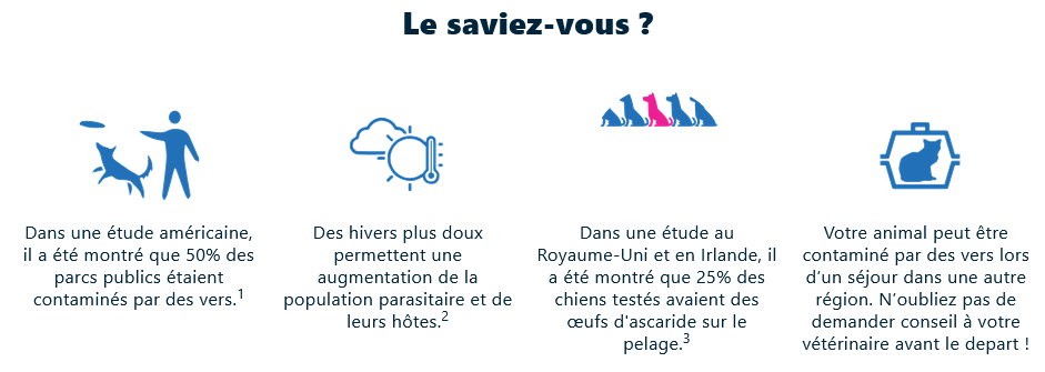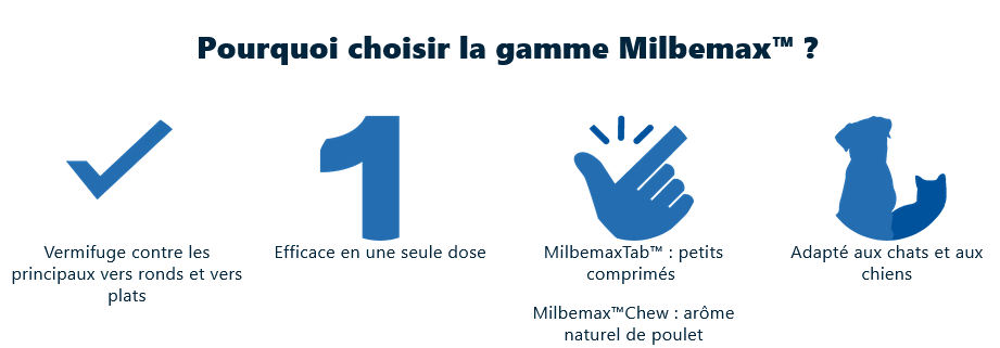 MilbemaxTab 12,5 mg/125 mg comprimés pour chiens, MilbemaxTab 2,5 mg/25 mg comprimés pour petits chiens et chiots, Milbemax Chew 12,5 mg/125 mg comprimés à croquer pour chiens, MilbemaxTab 16 mg/40 mg comprimés pelliculés pour chats, MilbemaxTab 4 mg/10 mg comprimés pelliculés pour petits chats et chatons sont des médicaments vétérinaires. Lisez attentivement la notice avant utilisation. Demandez conseil à votre vétérinaire/pharmacien. Si les symptômes persistent, consultez votre vétérinaire. Vermifuges contre les vers ronds et les vers plats. Se laver les mains après usage. En cas d’ingestion accidentelle en particulier par un enfant prendre l’avis d’un médecin immédiatement et lui montrer la boîte et/ou la notice. VGP 02/2024
