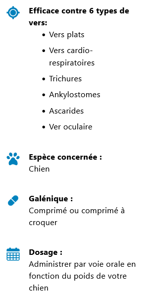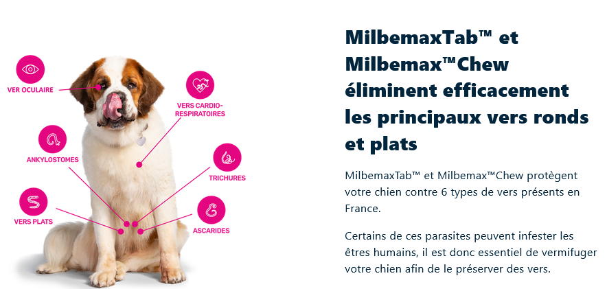 MilbemaxTab 12,5 mg/125 mg comprimés pour chiens, MilbemaxTab 2,5 mg/25 mg comprimés pour petits chiens et chiots, Milbemax Chew 12,5 mg/125 mg comprimés à croquer pour chiens, MilbemaxTab 16 mg/40 mg comprimés pelliculés pour chats, MilbemaxTab 4 mg/10 mg comprimés pelliculés pour petits chats et chatons sont des médicaments vétérinaires. Lisez attentivement la notice avant utilisation. Demandez conseil à votre vétérinaire/pharmacien. Si les symptômes persistent, consultez votre vétérinaire. Vermifuges contre les vers ronds et les vers plats. Se laver les mains après usage. En cas d’ingestion accidentelle en particulier par un enfant prendre l’avis d’un médecin immédiatement et lui montrer la boîte et/ou la notice. VGP 02/2024