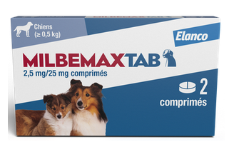 MilbemaxTab 12,5 mg/125 mg comprimés pour chiens, MilbemaxTab 2,5 mg/25 mg comprimés pour petits chiens et chiots, Milbemax Chew 12,5 mg/125 mg comprimés à croquer pour chiens, MilbemaxTab 16 mg/40 mg comprimés pelliculés pour chats, MilbemaxTab 4 mg/10 mg comprimés pelliculés pour petits chats et chatons sont des médicaments vétérinaires. Lisez attentivement la notice avant utilisation. Demandez conseil à votre vétérinaire/pharmacien. Si les symptômes persistent, consultez votre vétérinaire. Vermifuges contre les vers ronds et les vers plats. Se laver les mains après usage. En cas d’ingestion accidentelle en particulier par un enfant prendre l’avis d’un médecin immédiatement et lui montrer la boîte et/ou la notice. VGP 02/2024