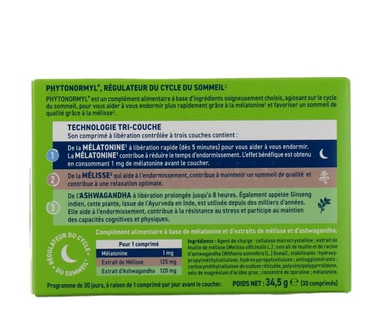 PHYTONORMYL est un complément alimentaire, agissant sur le cycle du sommeil, pour vous aider à vous endormir plus rapidement grâce à la mélatonine et favoriser un sommeil de qualité grâce à la mélisse.