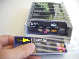 Enlevez le premier pilulier du jour en tirant légèrement du haut vers l’extérieur de la boite. Pour le remettre sur le devant, insérez le d’abord par le haut et appuyez sur le bas pour exercer une légère rotation. La journée finie, repoussez les 6 piluliers vers l’avant et positionnez le à l’arrière.