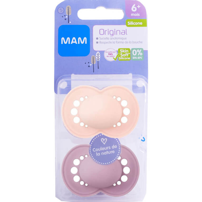 MAM Original 2 sucettes Anatomiques Silicone 6 mois et +. Elle est conçue en collaboration avec des dentistes pour assurer un développement bucco-dentaire optimal.