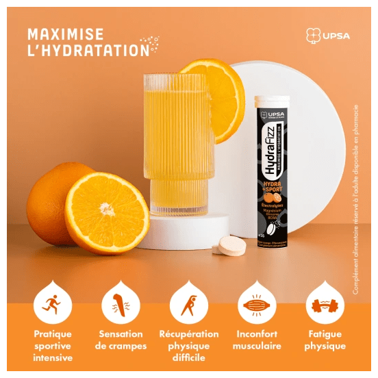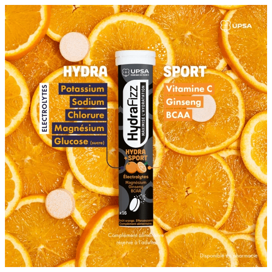 UPSA HydraFizz est un complément alimentaire à base d’électrolytes conçu pour maximiser l’hydratation du corps. A déguster à tout moment de la journée, il convient particulièrement lorsque vous souhaitez augmenter votre bien-être, lors d’un effort physique, de fortes chaleurs ou en cas de fatigue.