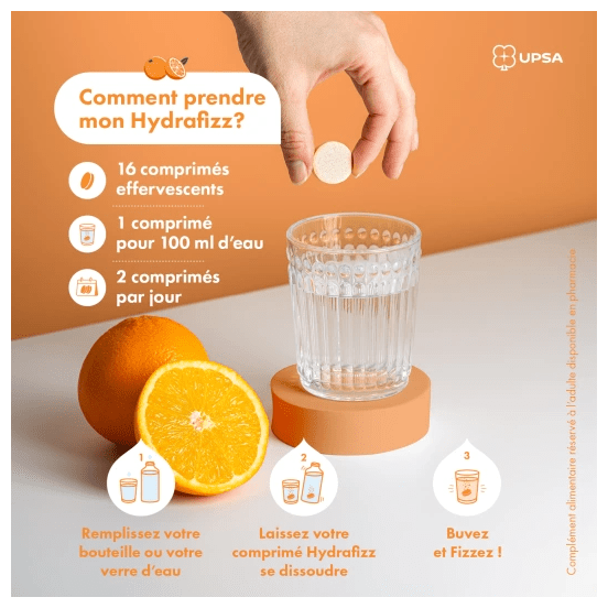 UPSA HydraFizz est un complément alimentaire dont l’usage est réservé à l’adulte. Il est indiqué de prendre deux comprimés effervescents par jour, à dissoudre dans un grand verre d’eau (200 ml).