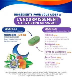 Pour 1 comprimé : Mélatonine 1,9mg, Extrait de mélisse 80mg, Extrait de passiflore 150mg, Extrait sec de racide de valériane 120mg, Extrait de pavot de Californie 100mg, Extrait d’Aubépine 50mg.